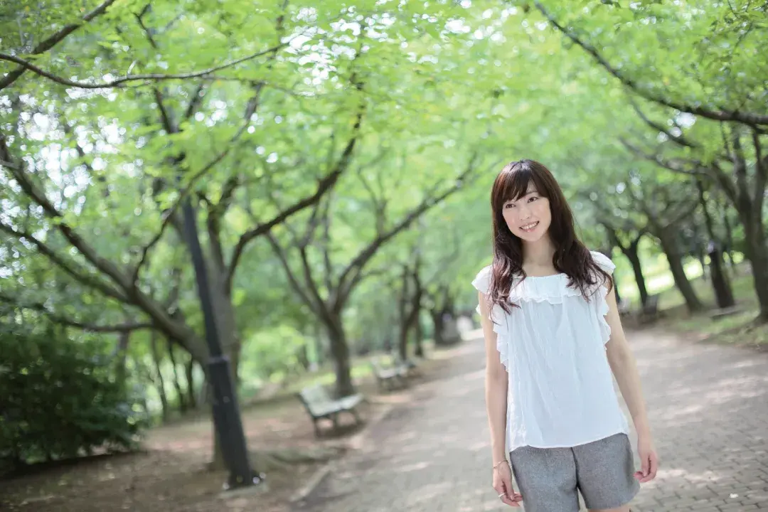 Shoot slightly away from the beautiful woman who is the subject of the shot, and place a large area of green elements in the composition within the shooting range. The beauty is not located in the center of the photo, but slightly to the right. The surrounding green color makes the facial color of the person less ideal, so a reflector is used to reflect strong light onto the person's face.