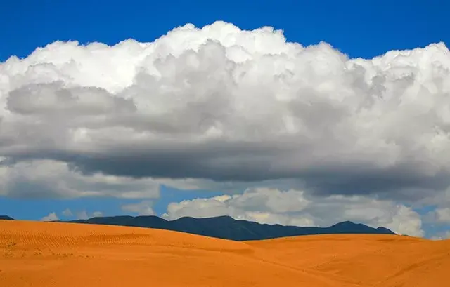 Clouds and Shadows "utilizes the combination of blue sky and white clouds, turning into gray blue mountains and golden sand dunes in the shadows