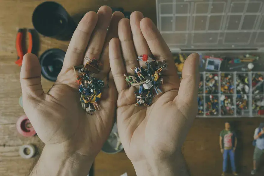 In early 2014, Viana discovered a box of“ Mini people; When he saw these little people, many interesting images created using these toy models instantly popped into his mind.