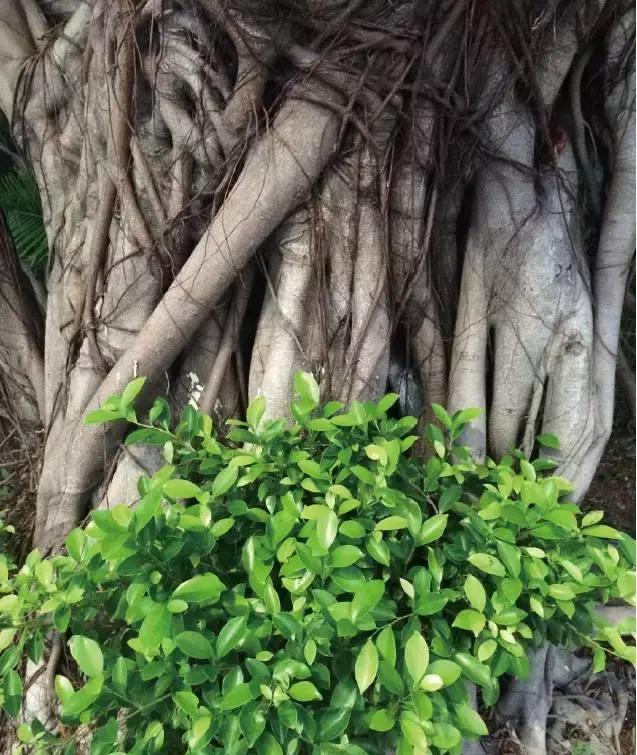 A small scene found on the street: the old roots show the age of the tree, while the tender green leaves under the roots show life, and the old and new green form a strong contrast
