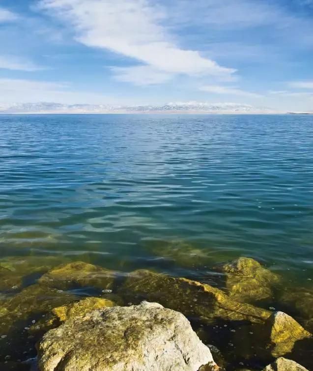 The stones on the shore form a sharp contrast with the distant horizon, which increases the sense of space in the picture