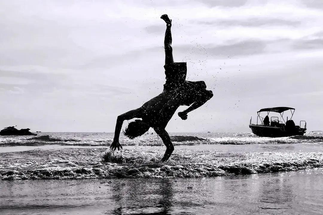 For example, when taking photos at the seaside, when you look around, the rolling waves have their own dynamic picture. At this time,Lower the shooting angleTaking the person who is somersaulting by the beach as the main body of the picture, the spread limbs of the characters, and the collision of water splash, the photo is filled with a sense of movement.