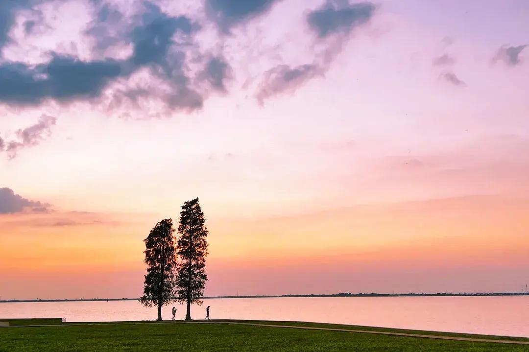 Like this riverside photo, under the pink-orange sky, two big trees stand next to each other by the riverside. If you simply take a picture of this scene, it will be an ordinary landscape photo. Cleverly, however, the photographer patiently waited for the appearance of "coincidence" and captured the picture of two pedestrians passing by, one in tandem, and the scene was small, which was very interesting.