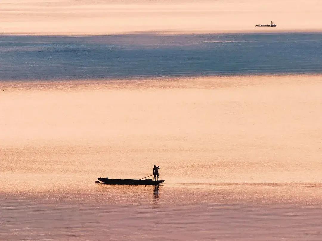 For another example, in the photo below, the photographer captured two fishing boats sailing on the river, one large and one small distributed in the frameDiagonal position, the picture is rich in spatial levels.