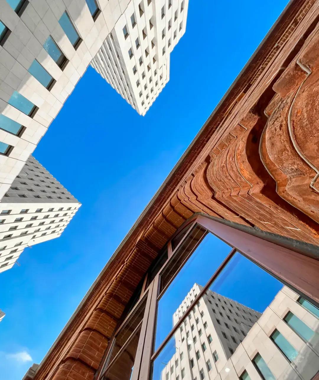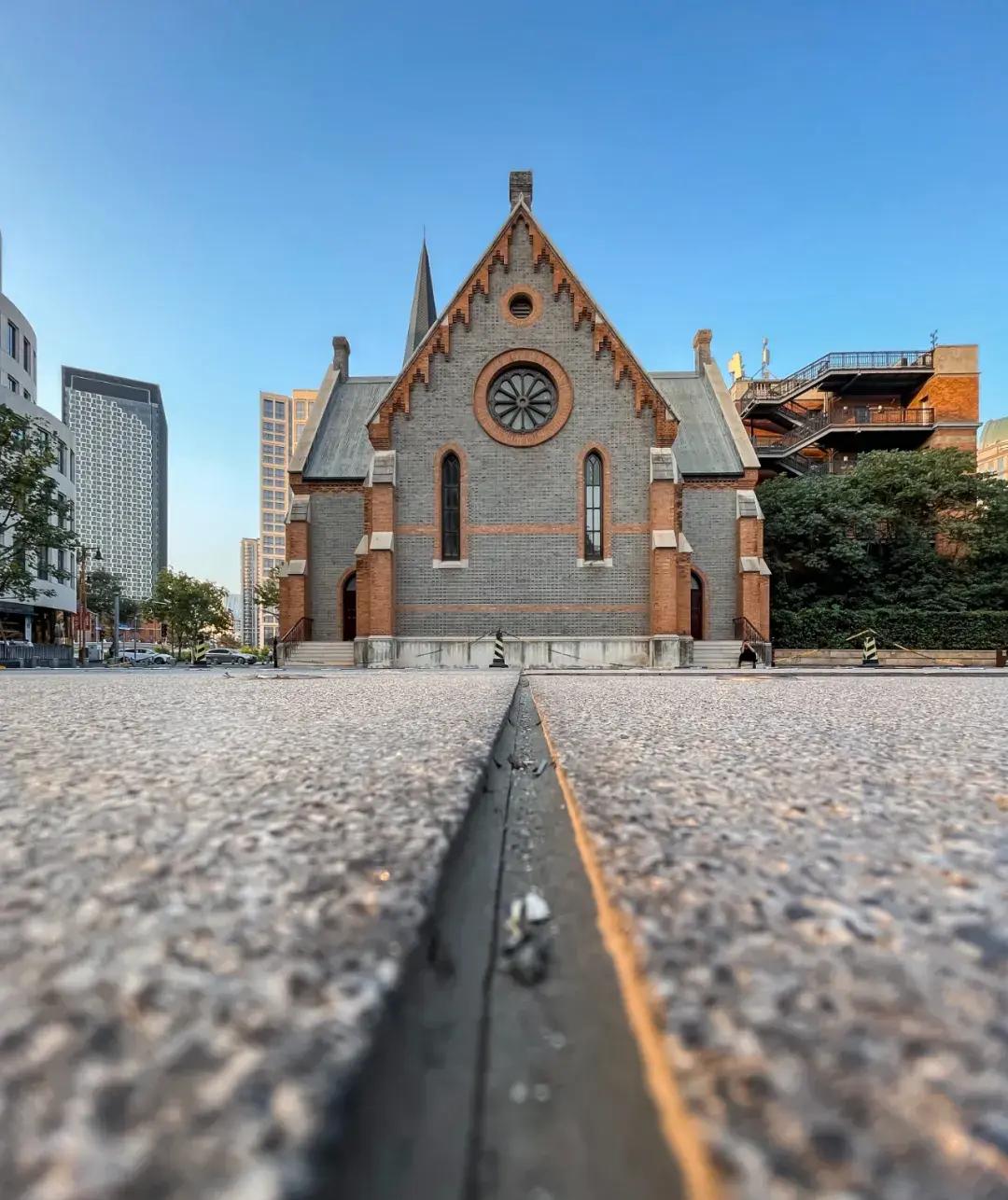 Changing the regular perspective will often lead to surprises. When shooting some towering buildings, you can use low-angle upward shooting.