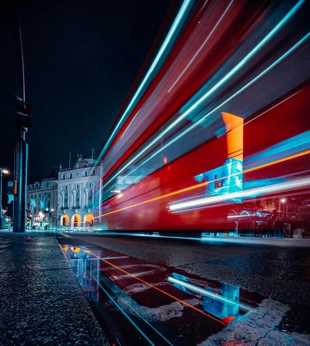 When shooting night scenes, only large cars with bright colors can leave beautiful colorful ghosts, so the choice of cars should be brightly colored and large cars as much as possible, and the track photos taken will look more attractive.