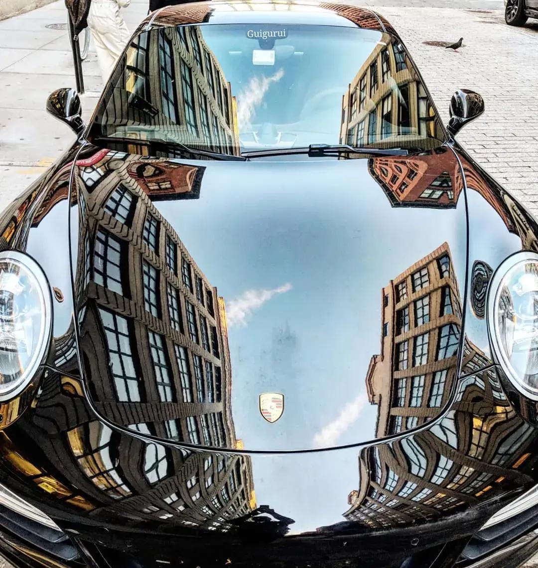 Because of the curvature of the car body, most of the reflected things are distorted, so the building reflected on the car will have a bizarre interest.