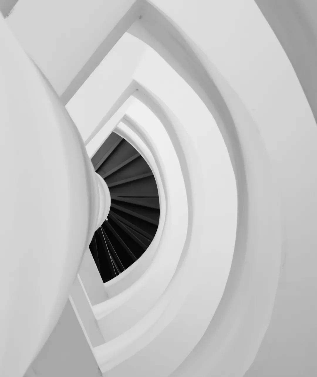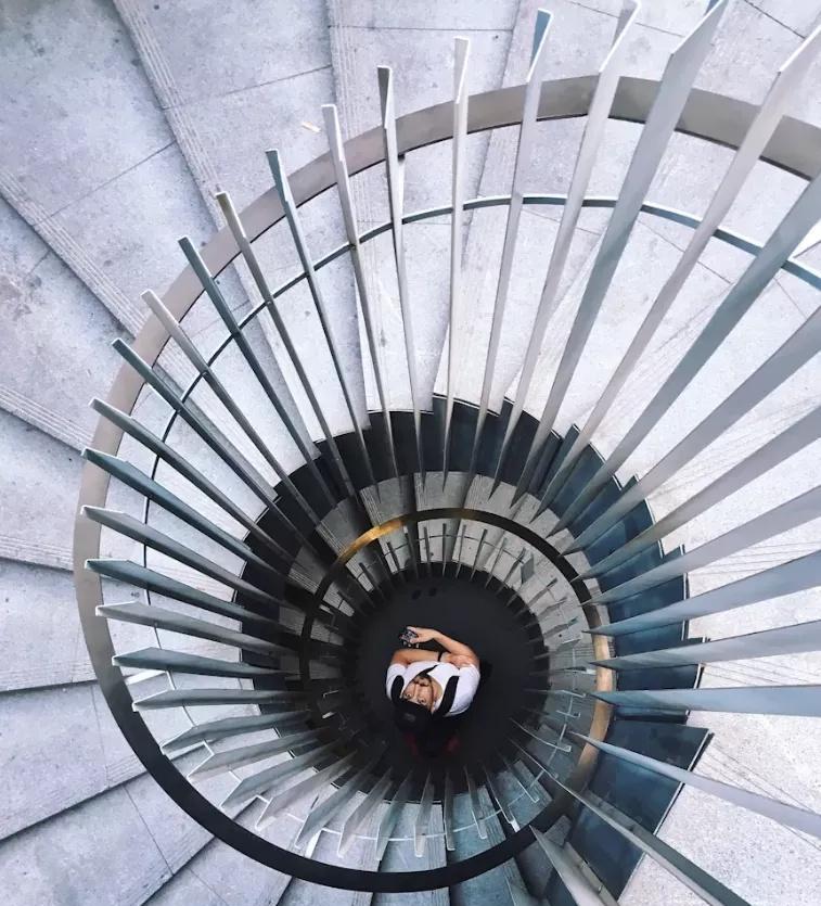 For example, taking the spiral staircase as the foreground of the frame, looking from the bottom of the building, the stair guardrail will form an obvious spiral effect, leading people's eyes from near to far, all the way to the center of the picture, and the picture will also produce a rotating dynamic effect.