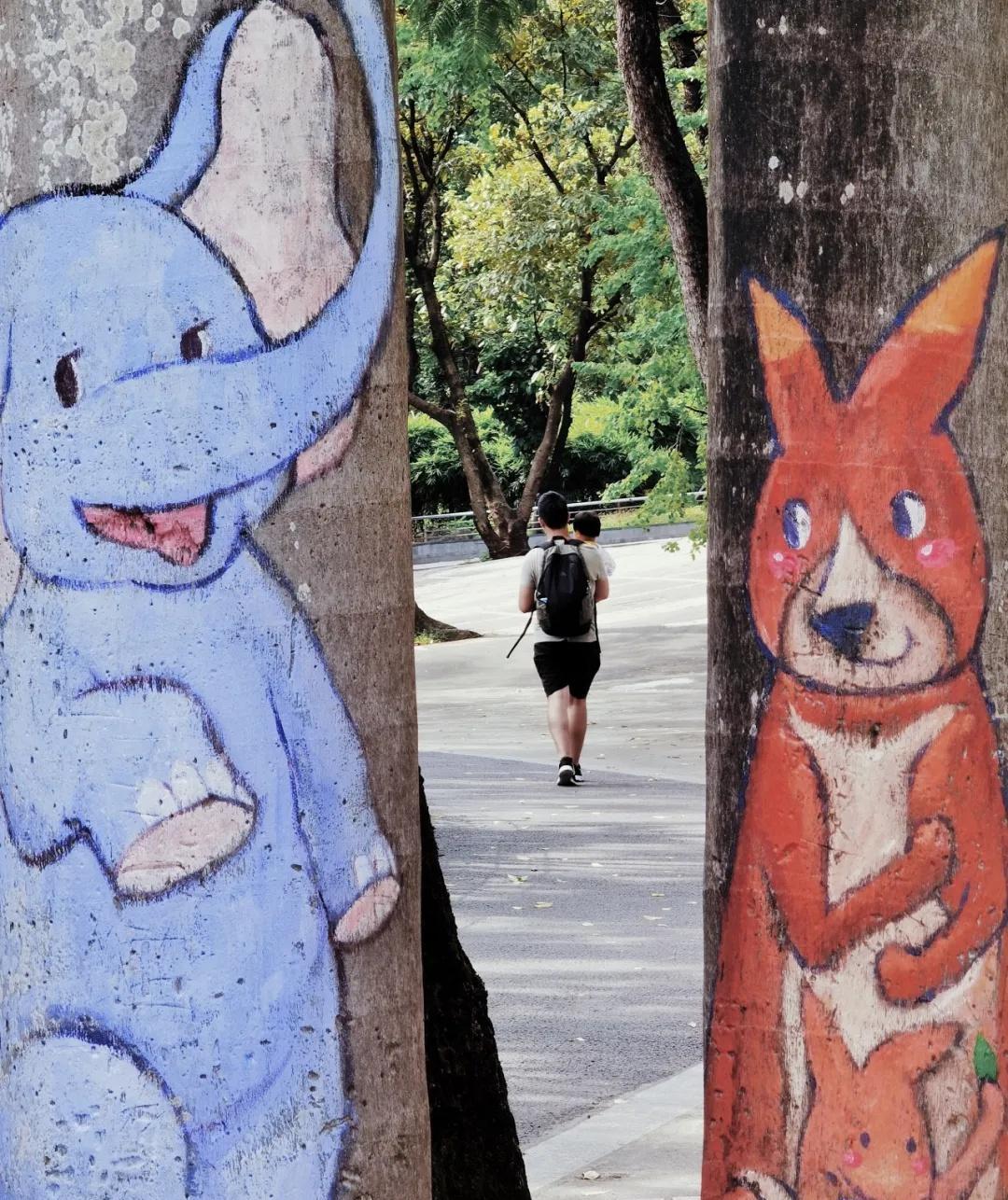 And the photo below, with two pillars printed with cartoon animals as the foreground, a father and daughter in the center of the picture, and the expressions of the cartoon characters seem to be plotting to surprise the father and daughter.